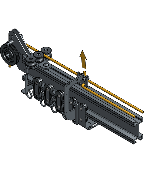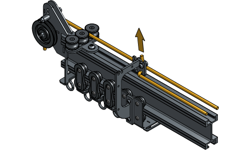 Loosen the Channel nut of the Curve Rope Guides until it fits inside the track profile and insert one every 3 m at each side of the track. Make sure they are oriented for the Master Carriers to be able to pass.