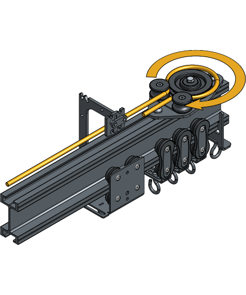 Guide the second rope end through the front side of the Head Pulley and all Curve Rope Guides and stop at the same Carrier.